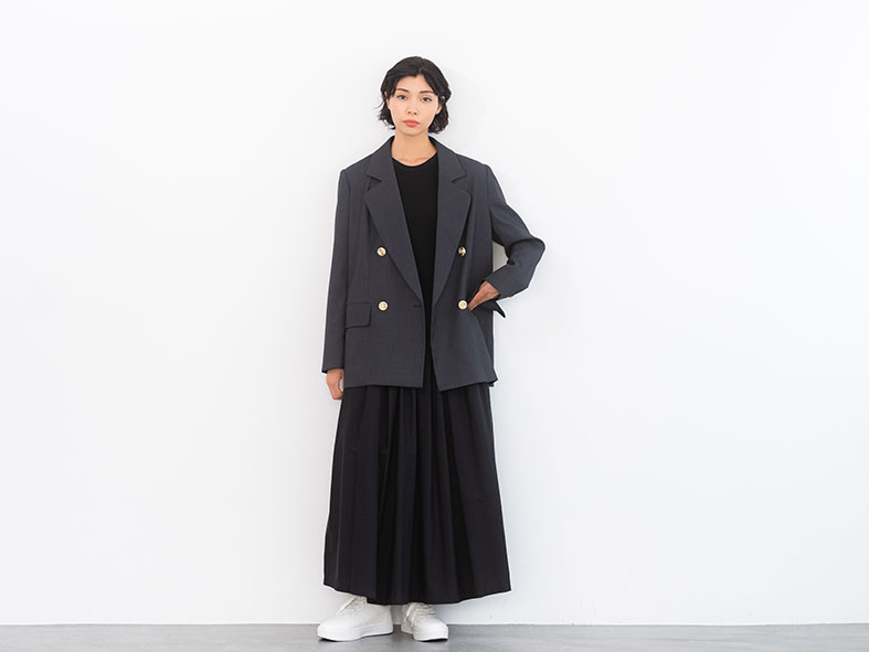 金ボタンのダブルジャケットはクラシックな端正さが魅力。グレーを選べばさらにメンズライクな印象が強まって、きりっとしたシャープなムードに。モノトーンコーデの引き締め役にも最適。