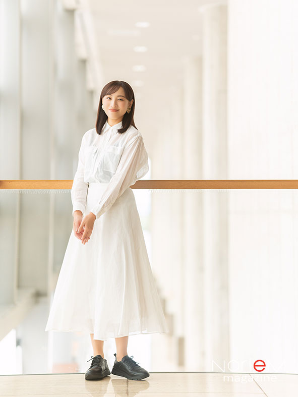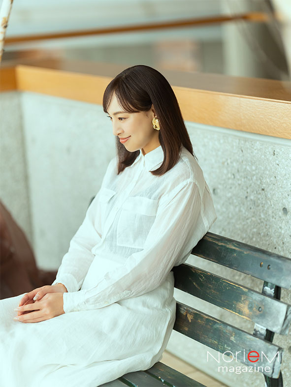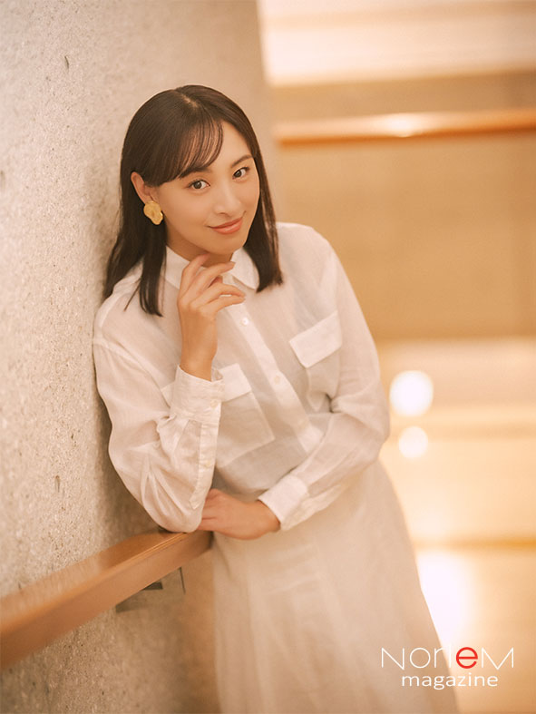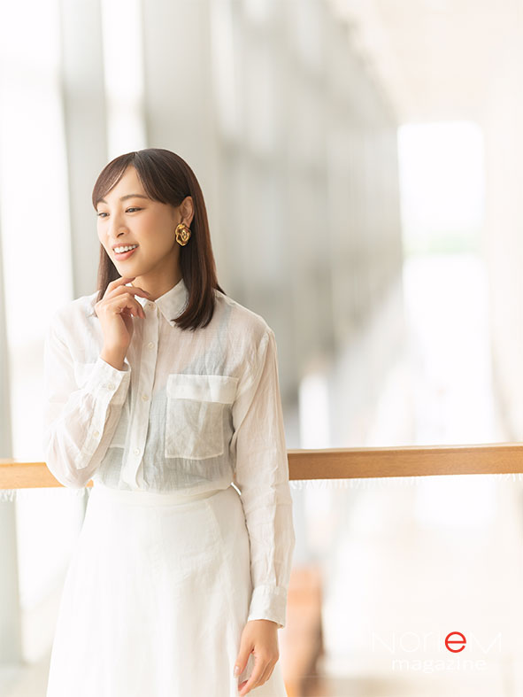 観客と舞台をつなぐ役は、お衣裳が白なんです。それに加えて、今回の作品は不条理で、白でも黒でもない、グレーな内容だと私は思ったので、そのどちらも衣裳で表現しようと白のセットアップに黒のインナーを選びました。普段は白のドレスならば、インナーも透けないようにベージュを選ぶと思いますが、今回はこのアンバランスさが楽しいのかなと思って。私自身は、本当は白黒はっきりした芝居が好きでしたが、今回、この作品のお稽古をしていて、奥行きの深さや「これってどうなんだろう」と想像することの楽しさを教えていただいたように思います。きっと観劇するお客さまは、帰り道に一緒に観に来られた方と「あそこはどうなんだろう」と話すのも楽しいのだろうなと。グレーな作品も面白いんだと改めて感じたので、この作品からインスパイアされて、今日のお洋服にしました。