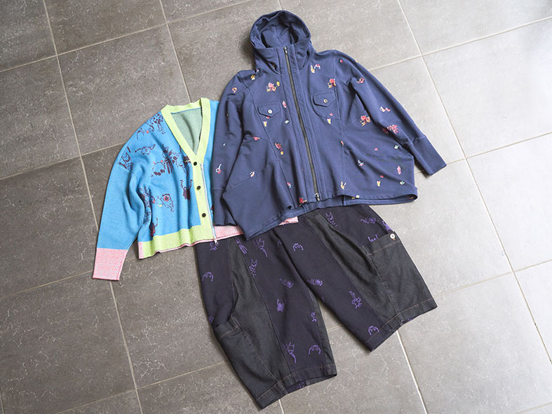 ▶︎この冬のテーマに登場するモンスターを刺繍で全体に散りばめ、腰下からふくらみを持たせたワイドシルエットパンツ。