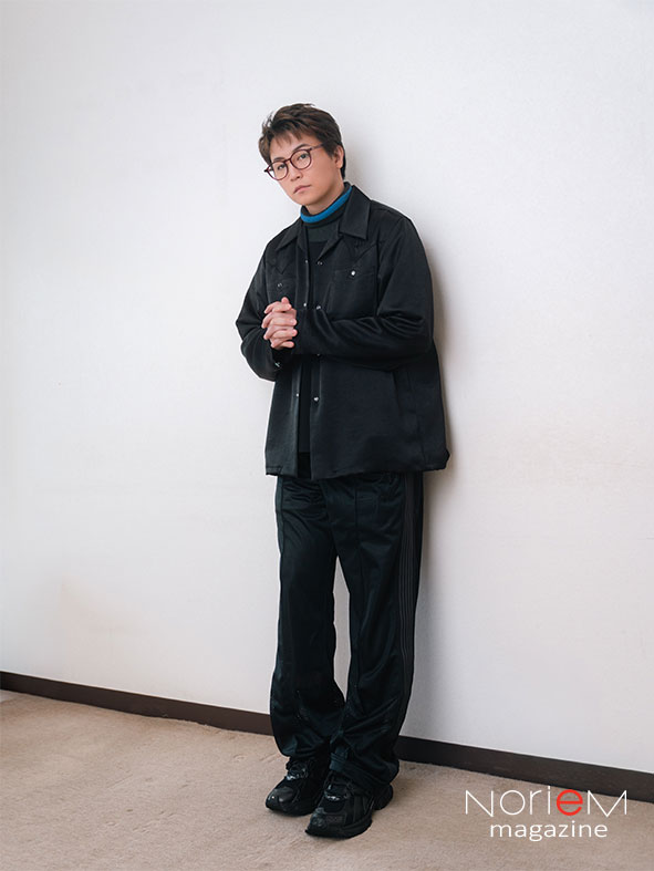 NEEDLESのトラックパンツに、BALENCIAGAの靴を合わせました。2019年頃に流行っていたので、よくBALENCIAGAのTriple Sという靴を履いていたんですが、僕には大きすぎて足が痛くて。当時は無理して履いていましたが、それをやめてからはBALENCIAGAを履いていなかったんです。ただ、今回、この靴を履いたらめちゃくちゃ履きやすかったんですよ。しかも、ワイドなパンツに合わせるとかわいい。このスタイルが気に入って選びました。
