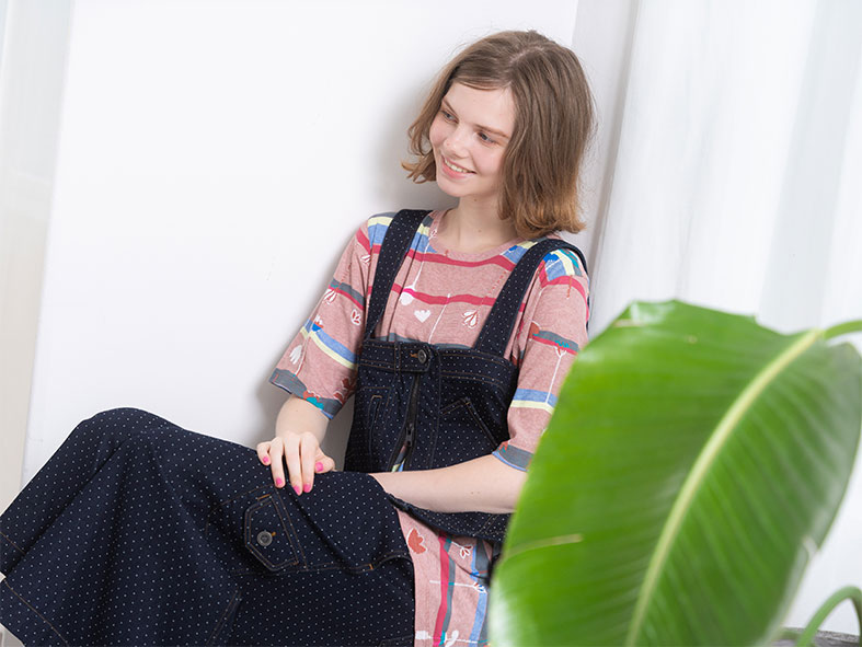 ドット柄が目を惹くベストとパンツのセットアップ。ポケットが多く配したデザインが、よりキュートな印象を引き立てます。カラフルなマルチボーダーのプルオーバーをレイヤードして、ポップなスタイルを作ります。